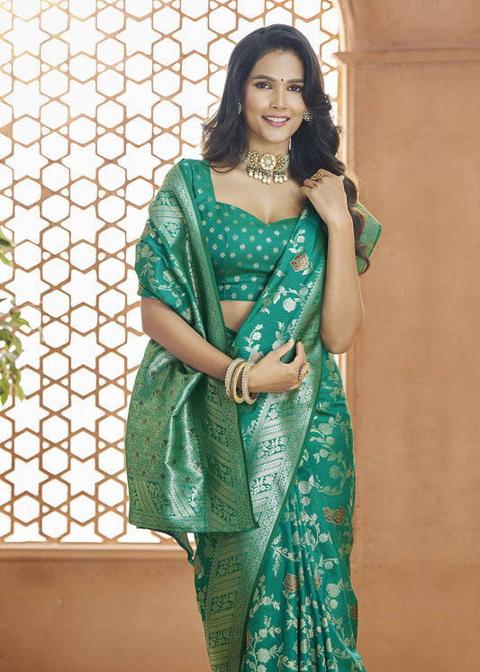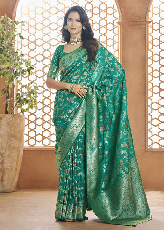 Dark Green Thread Embroidered Pashmina Silk Saree