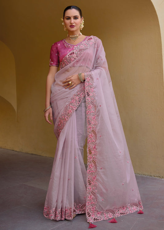 Light Pink color organza saree crafted in thread and zari embroidery and sequin work all...