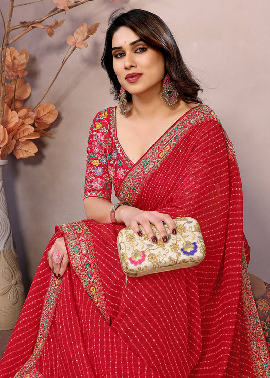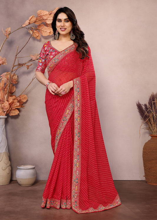 Red Satin Silk Embroidered Party Wear Bridal Saree