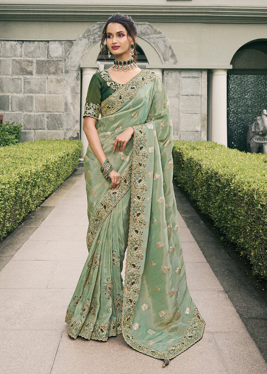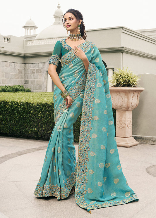 Turquoise Zari Embroidered Saree In Tissue Silk
