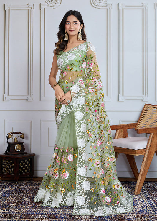Green Embroidered Party Wear Saree In Net