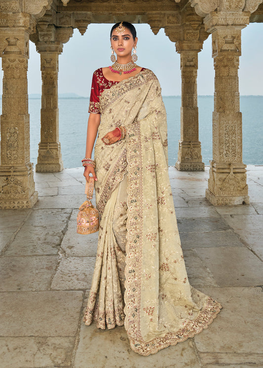 Beige Zari Silk Embroidered Bridal Saree In Silk