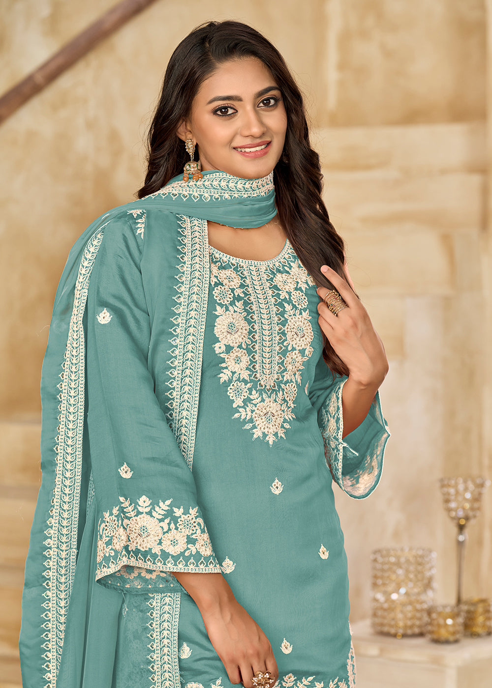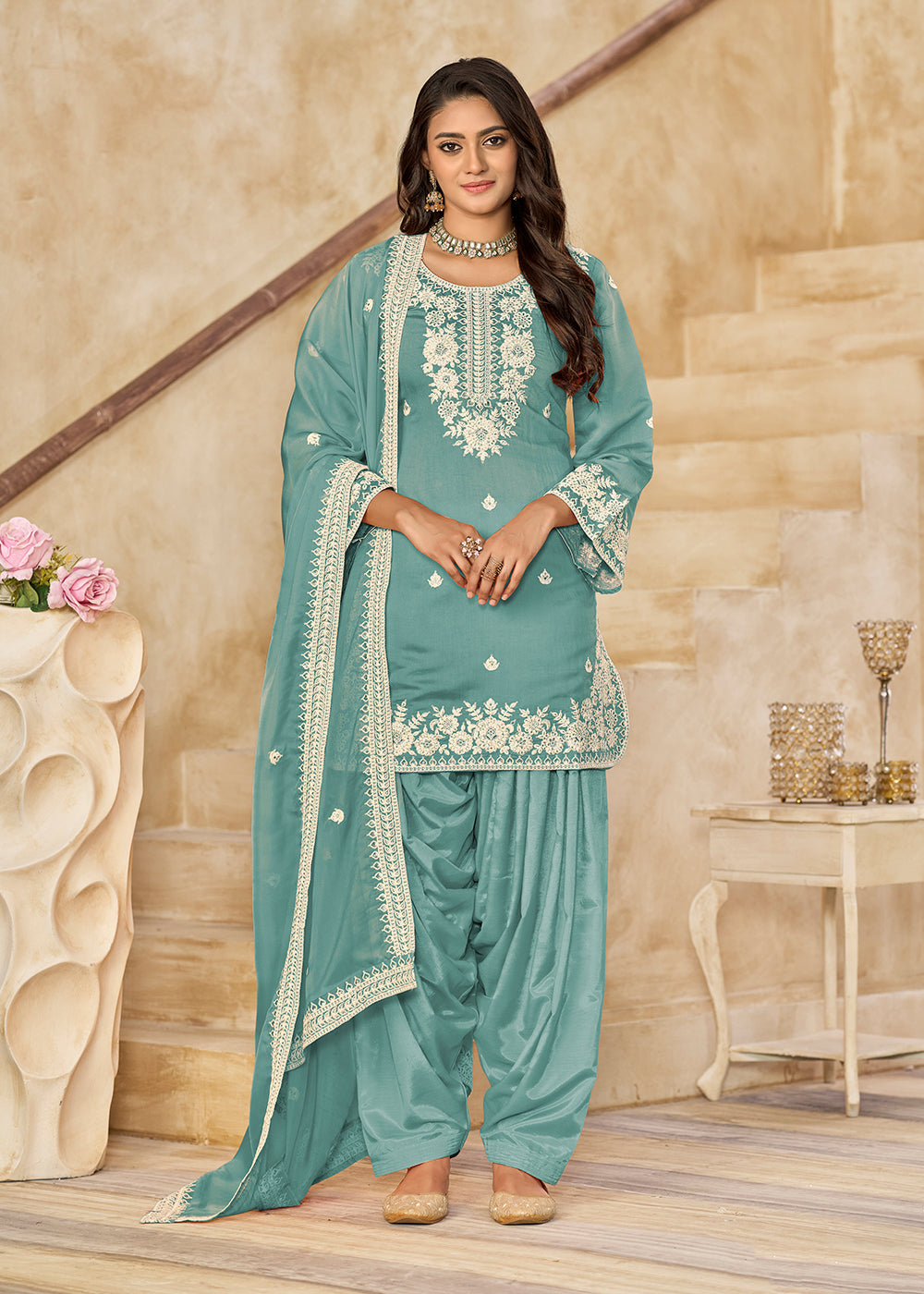 Aqua Blue Thread Embroidered Punjabi Salwar Kameez