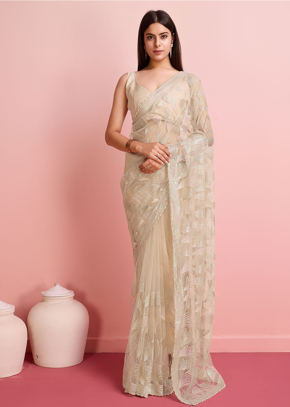 Beige color net saree crafted in heavy embroidery sequin work all over. Comes along with a matching color blouse. The un-stitched saree blouse may be customized up to 44 inches.
