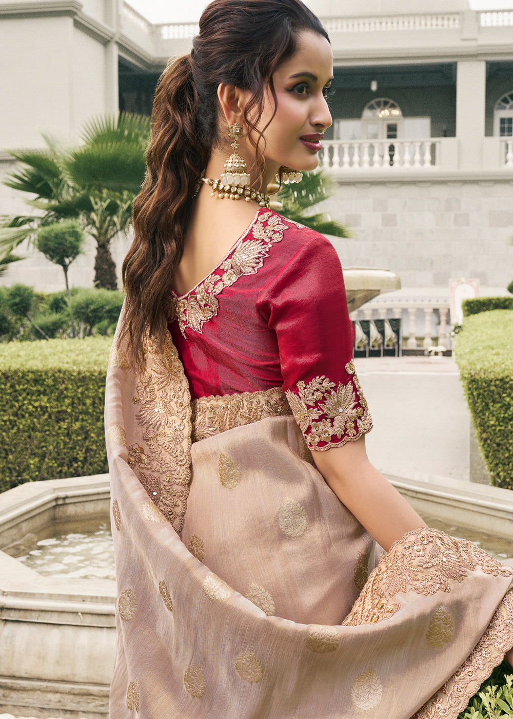Beige tissue silk saree crafted in heavy zari embroidery and sequin, stone work all over. Comes along with a maroon color silk blouse in similar work . The un-stitched saree blouse may be customized up to 44 inches.