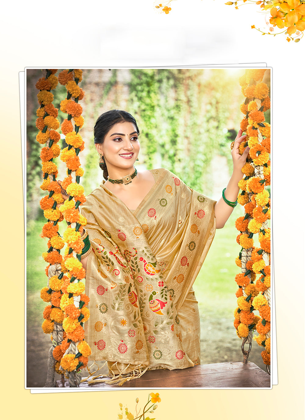 Beige designer silk saree crafted in zari woven work all over. Comes along with a matching color blouse in similar work . The un-stitched saree blouse may be customized up to 44 inches.