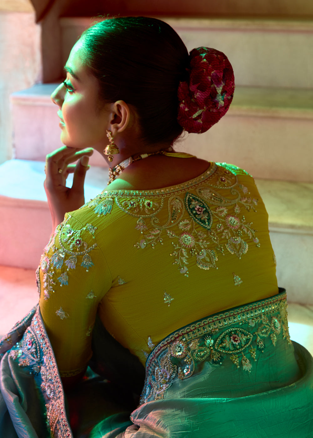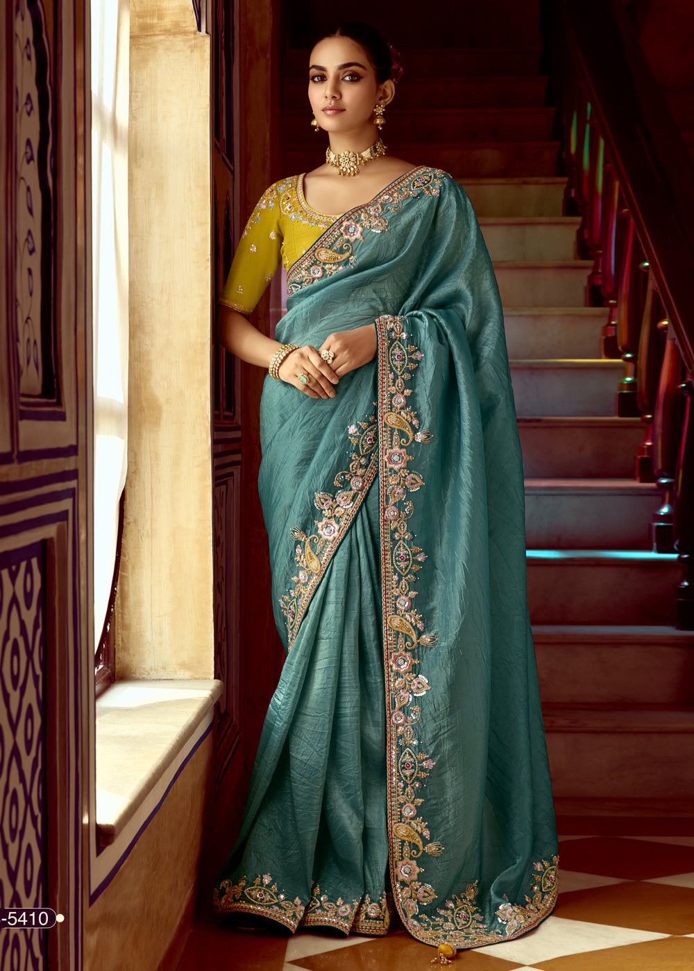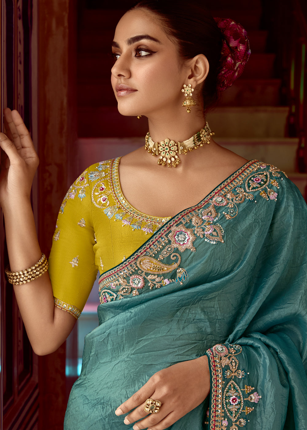 Blue silk saree crafted in heavy embroidered sequin and moti work all over. Comes along with a Yellow color silk blouse in similar work . The un-stitched saree blouse may be customized up to 44 inches.