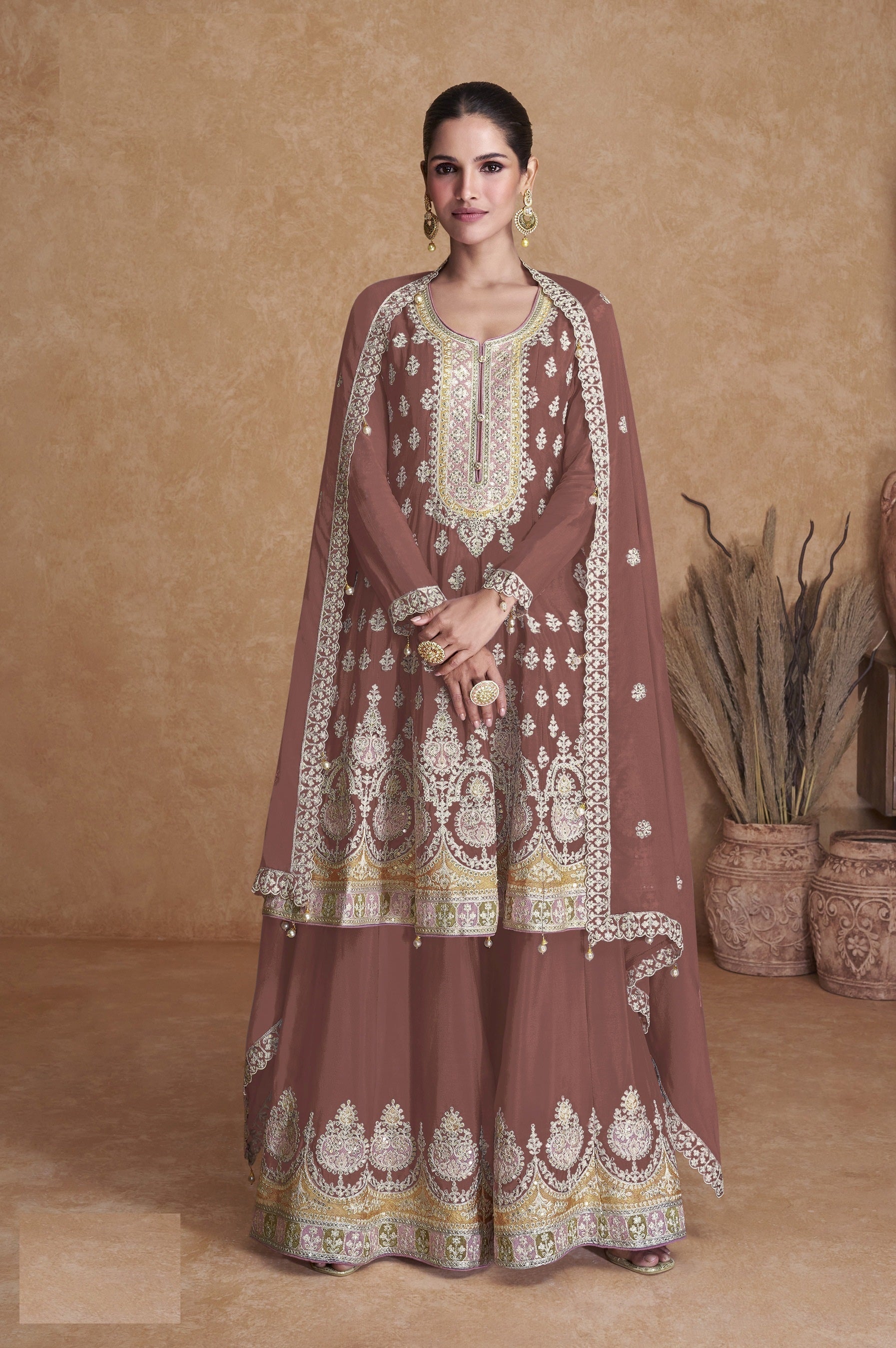 Brown colored straight kameez in georgette with heavy zari & thread embroidery and sequin work all over. Comes with matching colored sharara bottom and georgette dupatta. The semi-stitched kameez can be customised upto 44 inches. Do Note: All the accessories shown are for styling purposes only. Slight color variation may occur due to photographic reasons.