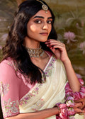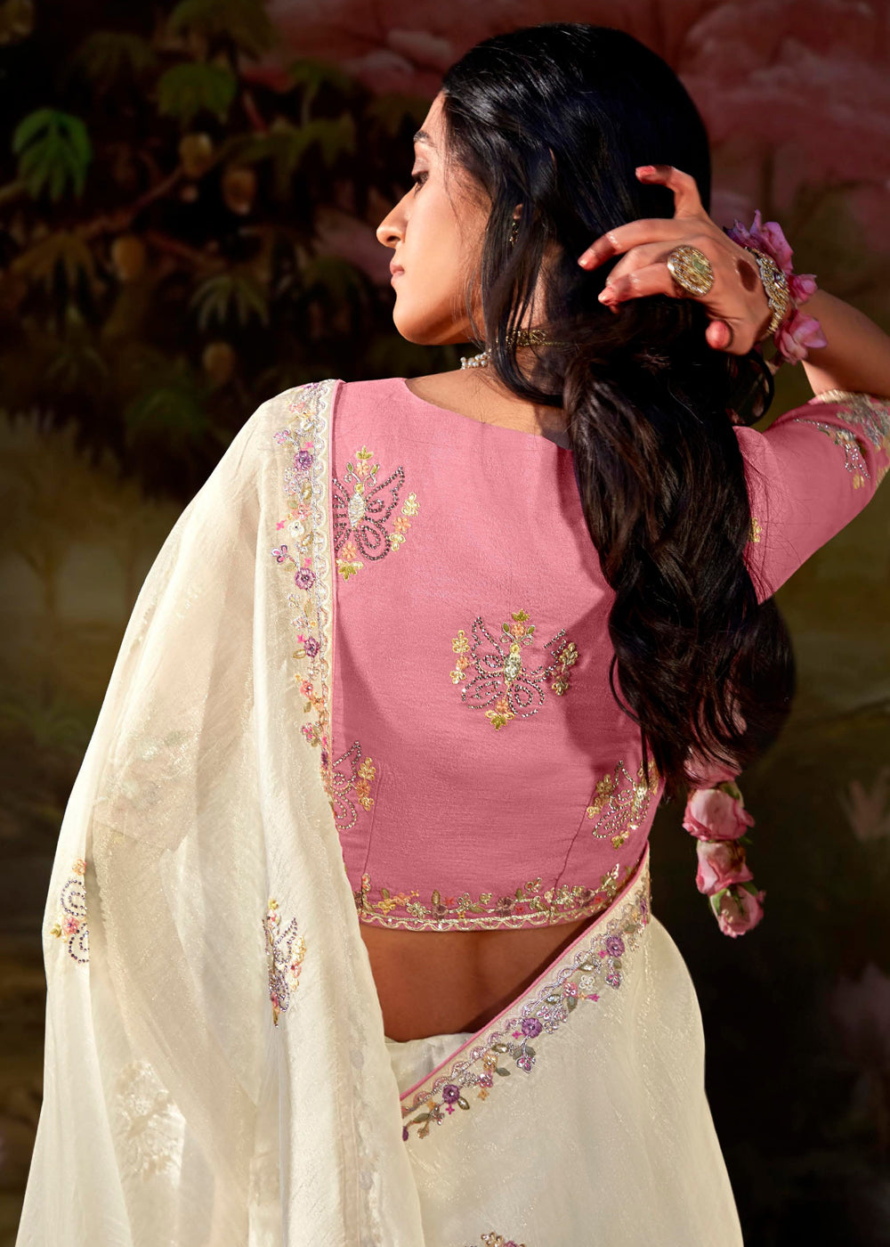 Cream organza chiffon saree crafted in heavy thread embroidery and sequin work all over. Comes along with a pink color blouse. The un-stitched saree blouse may be customized up to 44 inches.