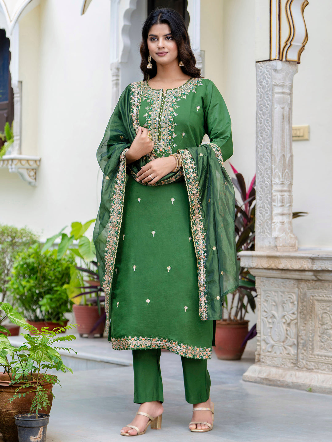 Green colored straight cut style readymade kameez in heavy embroidery work all over. Comes with matching color bottom and dupatta. Do Note: All the accessories shown are for styling purposes only. Slight color variation may occur due to photographic reasons.