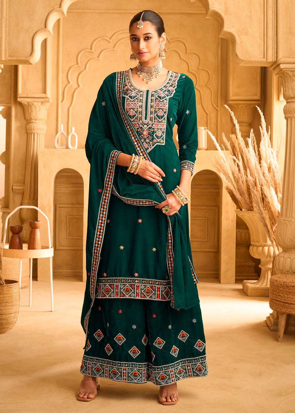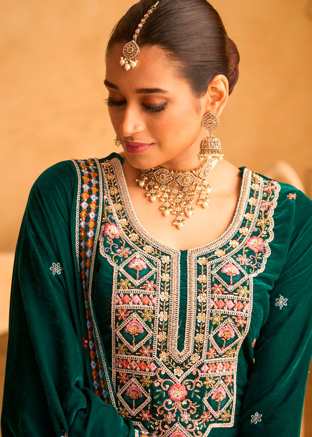 Green colored straight cut style kameez in velvet with thread embroidery work all over. Comes with matching colored bottom and dupatta. The semi-stitched kameez can be customised upto 44 inches. Do Note: All the accessories shown are for styling purposes only. Slight color variation may occur due to photographic reasons.