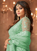 Green colored anarkali style kameez in net with heavy zari & sequin embroidery work all over. Comes with matching colored santoon bottom and net dupatta. The semi-stitched kameez can be customised upto 44 inches. Do Note: All the accessories shown are for styling purposes only. Slight color variation may occur due to photographic reasons.
