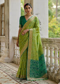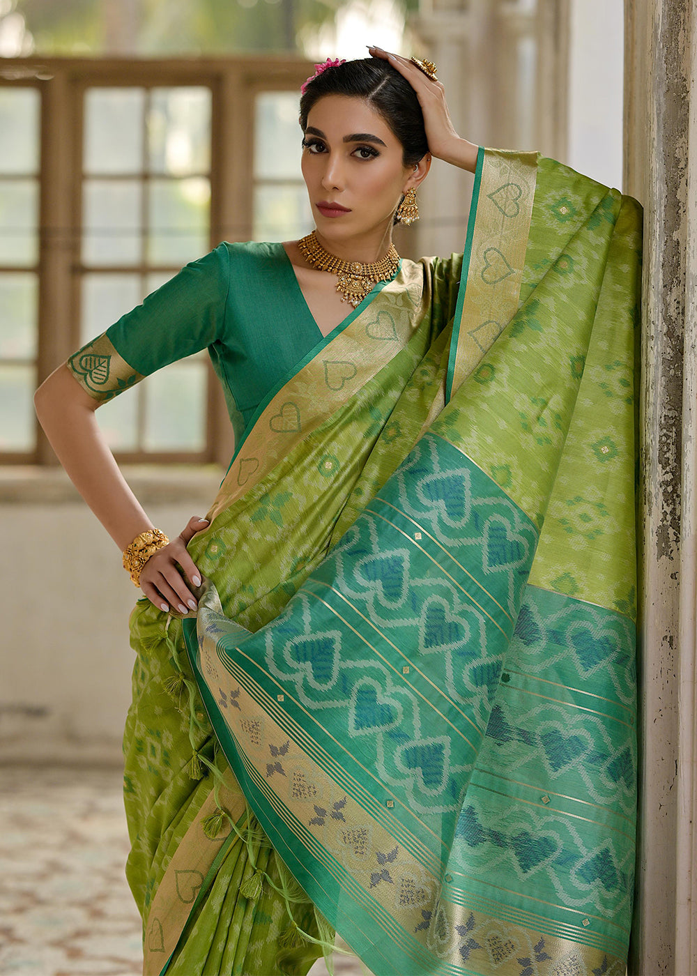 Green raw silk saree crafted in zari woven embroidery work all over. Comes along with a green color silk blouse in similar work . The un-stitched saree blouse may be customized up to 44 inches.