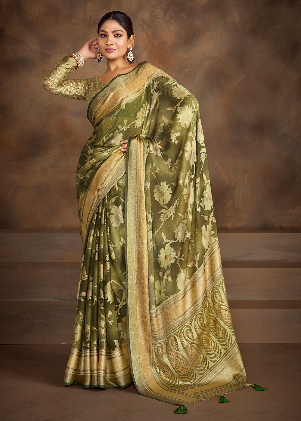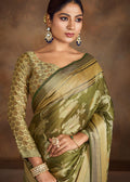 Green satin silk saree crafted in zari woven embroidery all over. Comes along with a matching color silk blouse in similar work . The un-stitched saree blouse may be customized up to 44 inches.