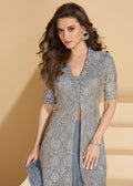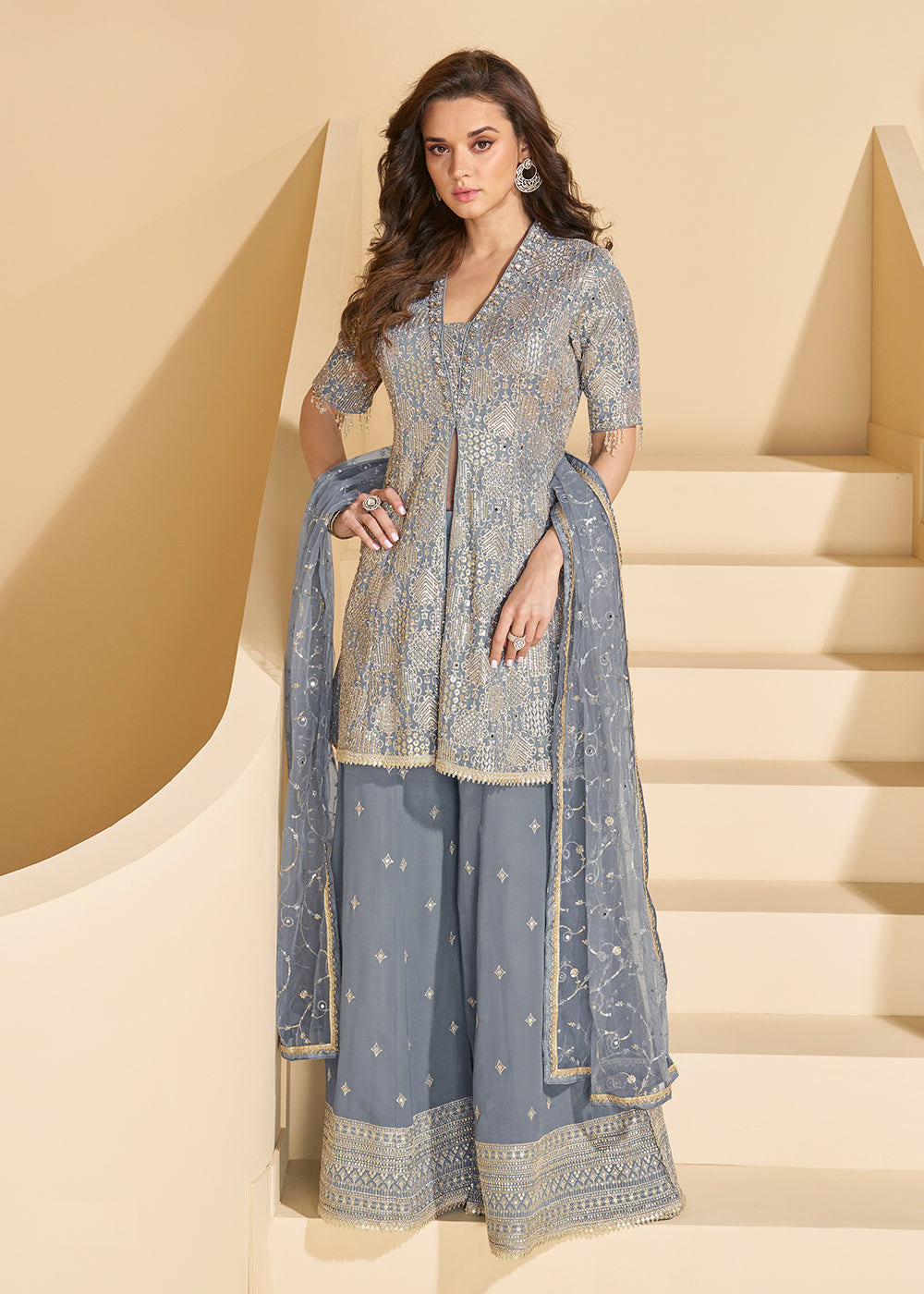 Grey colored sharara style kameez in georgette with zari & sequin embroidery work all over. Comes with matching colored bottom and dupatta. The semi-stitched kameez can be customised upto 42 inches. Do Note: All the accessories shown are for styling purposes only. Slight color variation may occur due to photographic reasons.