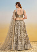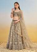 Grey color lehenga in net decorated all over heavy zari embroidery and sequin work all over. Comes along with a matching color choli and dupatta in similar work. The semi-stitched choli can be customized up to 42 inches. Do Note: All Accessories shown are for styling purpose only. Slight color variation may occur due to photographic reasons.