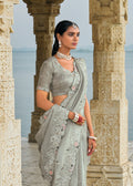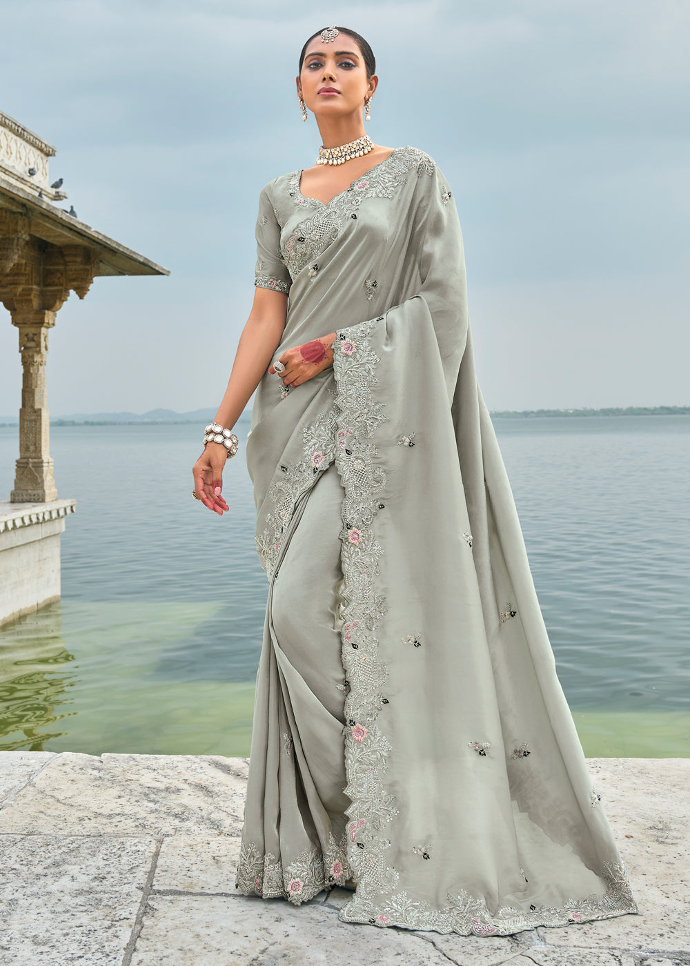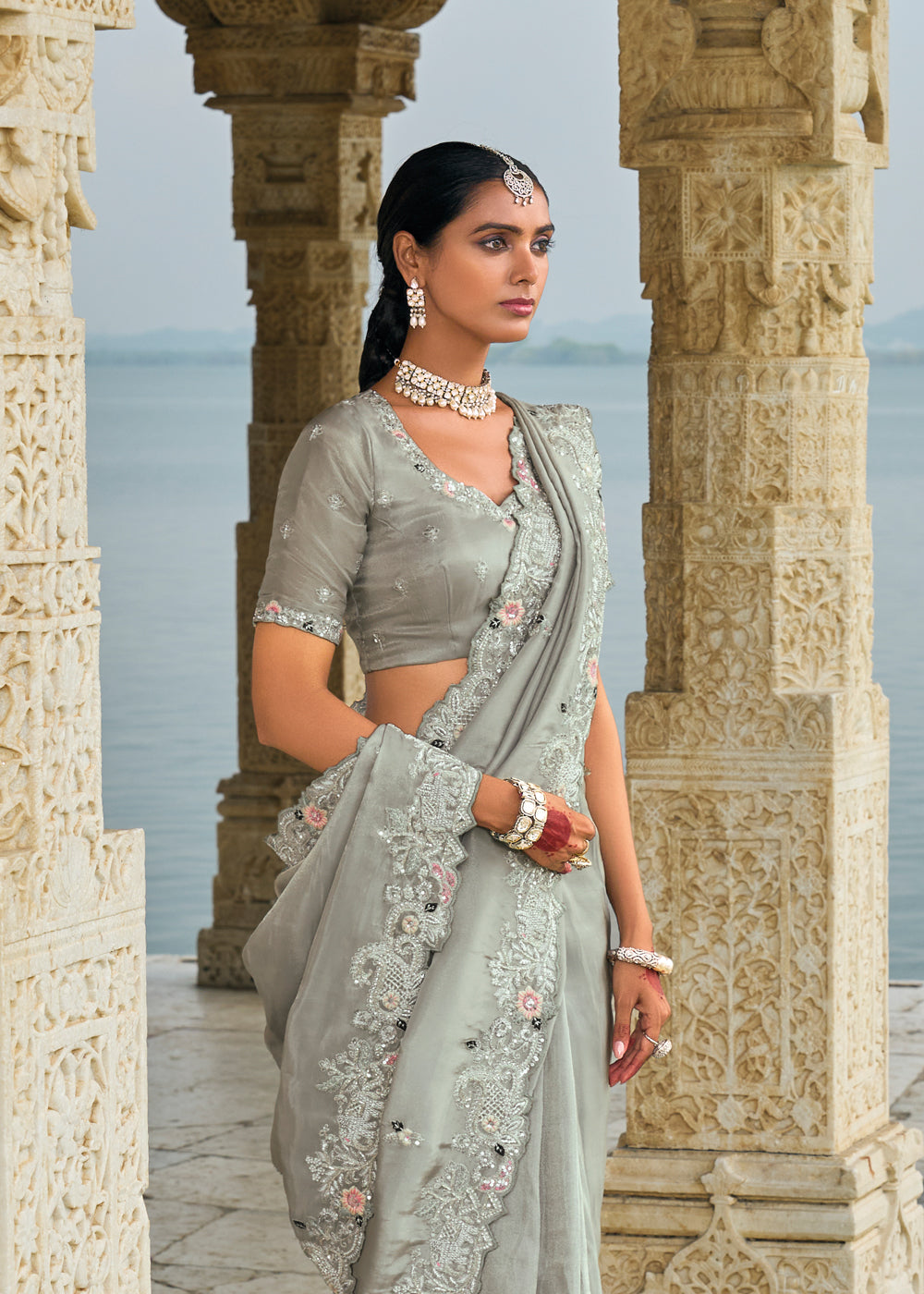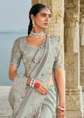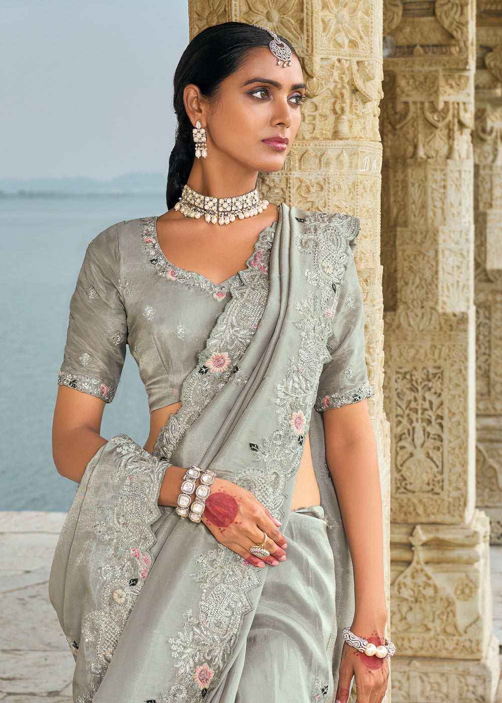 Grey banarasi silk saree crafted in heavy thread embroidery and sequin work all over. Comes along with a grey color silk blouse in similar work . The un-stitched saree blouse may be customized up to 44 inches.