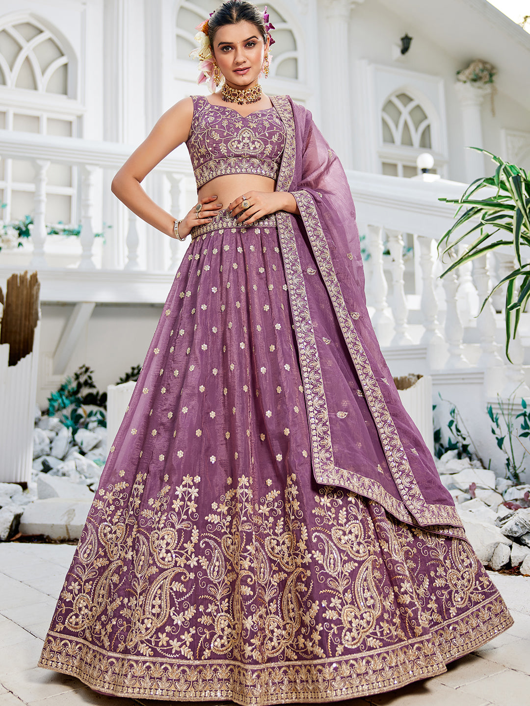 Lavender color lehenga in tisse silk decorated all over heavy embroidery and sequin work all over. Comes along with a matching color choli and dupatta in similar work. The semi-stitched choli can be customized up to 42 inches. Do Note: All Accessories shown are for styling purpose only. Slight color variation may occur due to photographic reasons.