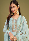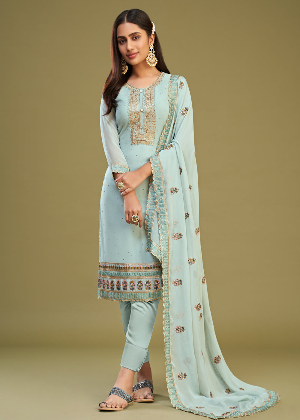 Light Blue colored straight cut kameez in georgette with heavy thread embroidery and sequin work all over. Comes with matching colored pant and dupatta with similar work.