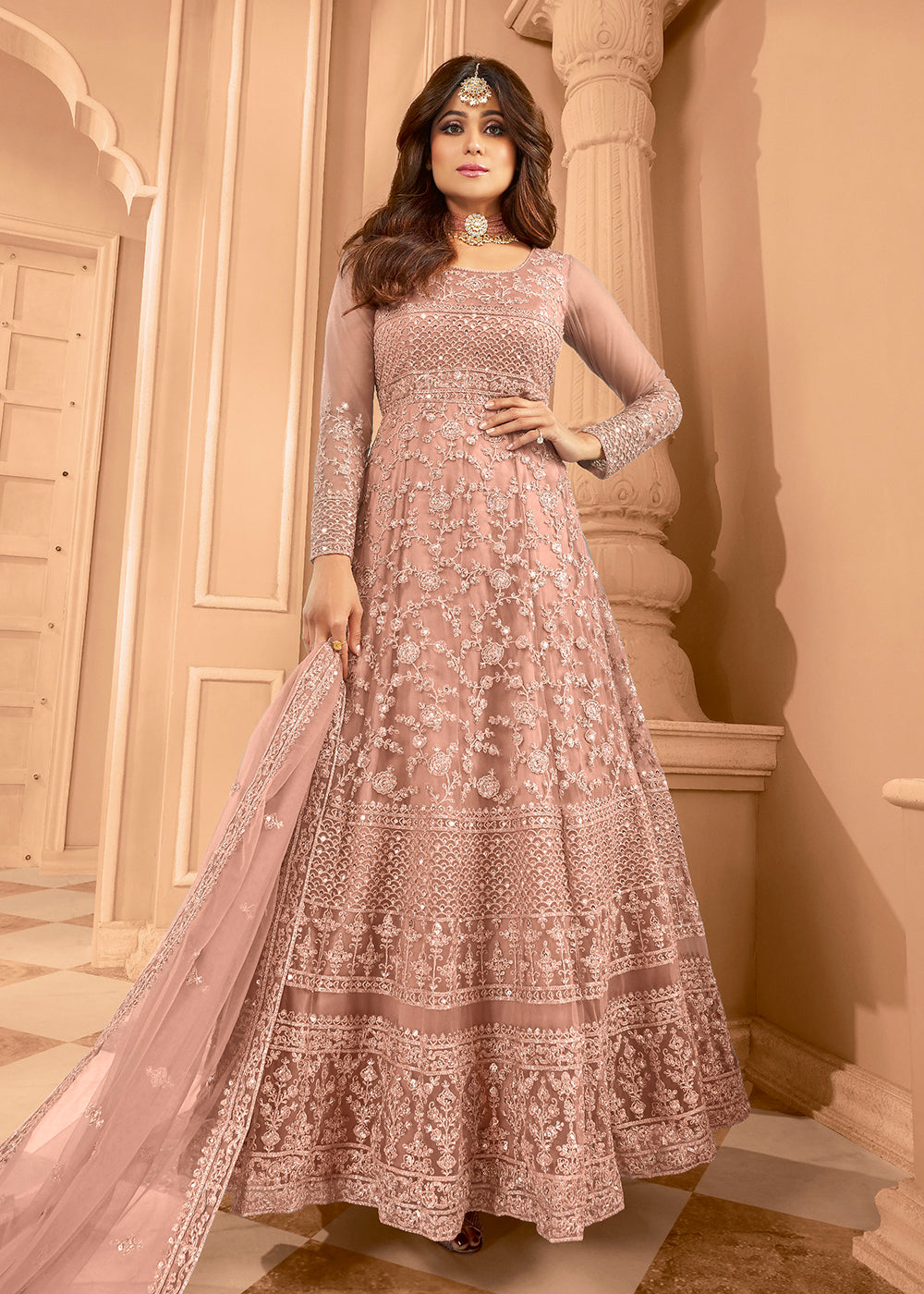 Mauve colored anarkali style kameez in net with heavy zari & sequin embroidery work all over. Comes with matching colored santoon bottom and net dupatta. The semi-stitched kameez can be customised upto 44 inches. Do Note: All the accessories shown are for styling purposes only. Slight color variation may occur due to photographic reasons.