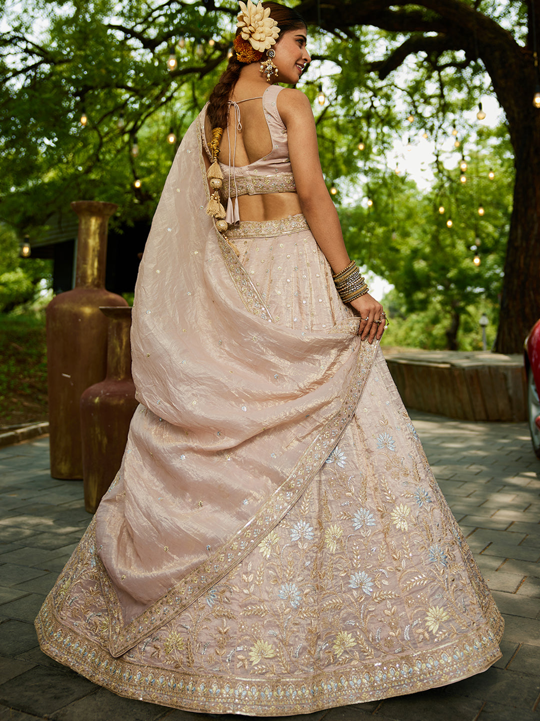 Mauve color lehenga in tisse silk decorated all over heavy embroidery and sequin work all over. Comes along with a matching color choli and dupatta in similar work. The semi-stitched choli can be customized up to 42 inches. Do Note: All Accessories shown are for styling purpose only. Slight color variation may occur due to photographic reasons.