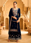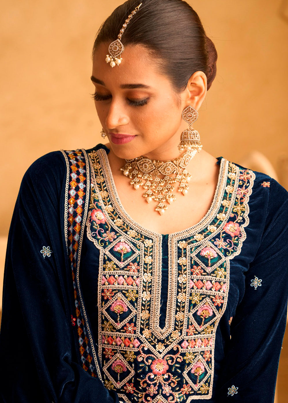 Navy Blue colored straight cut style kameez in velvet with thread embroidery work all over. Comes with matching colored bottom and dupatta. The semi-stitched kameez can be customised upto 44 inches. Do Note: All the accessories shown are for styling purposes only. Slight color variation may occur due to photographic reasons.