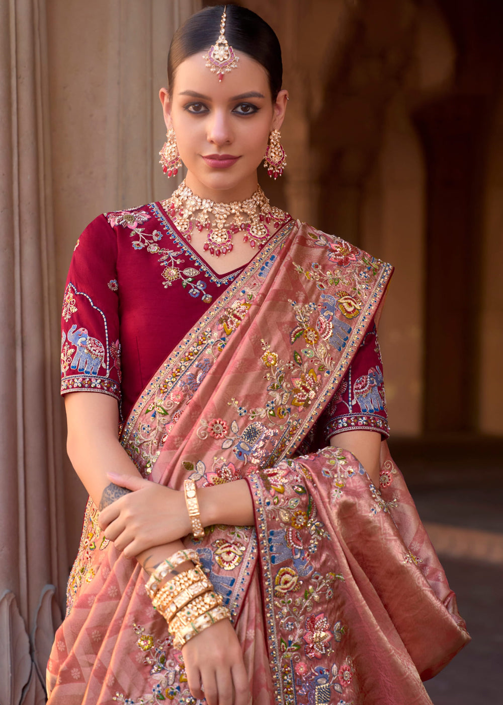 Peach Organza silk saree crafted in heavy thread & zari embroidery, sequin and stone work all over. Comes along with a red color silk blouse in similar work . The un-stitched saree blouse may be customized up to 44 inches.