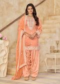 Peach colored punjabi style kameez in silk with thread embroidery work all over. Comes with matching colored bottom and organza dupatta. The semi-stitched kameez can be customised upto 42 inches. Do Note: All the accessories shown are for styling purposes only. Slight color variation may occur due to photographic reasons.