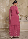 Pink colored straight cut kameez in chinon with heavy zari embroidery and sequin work all over. Comes with matching colored chinon sharara and art silk dupatta. The semi-stitched kameez can be customised upto 42 inches. Do Note: All the accessories shown are for styling purposes only. Slight color variation may occur due to photographic reasons.