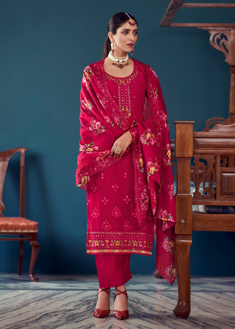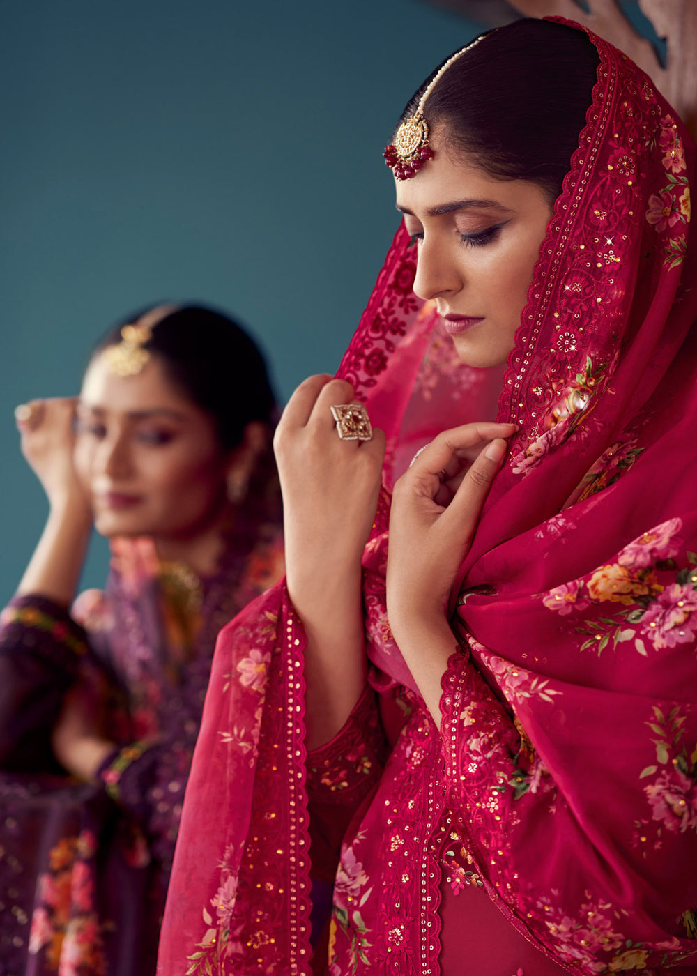 Pink colored straight cut kameez in georgette with heavy thread floral embroidery sequin and stone work all over. Comes along with matching colored palazzo in santoon and floral printed organza dupatta. The semi-stitched kameez can be customised up to 42 inches.