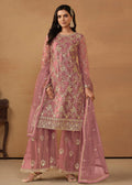 Pink colored straight cut kameez in net with heavy zari embroidery and sequin work all over. Comes with matching colored sharara in satin and net dupatta. The semi-stitched kameez can be customised up to 42 inches.