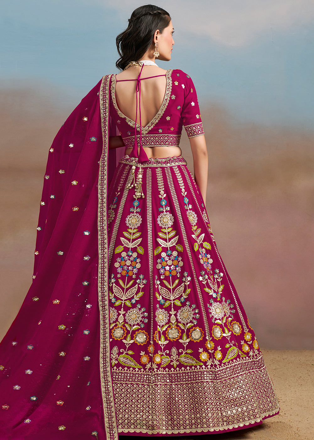 Pink color lehenga in georgette decorated all over heavy thread and zari embroidery and sequin work all over. Comes along with a matching color choli and dupatta in similar work. The semi-stitched choli can be customized up to 42 inches. Do Note: All Accessories shown are for styling purpose only. Slight color variation may occur due to photographic reasons.