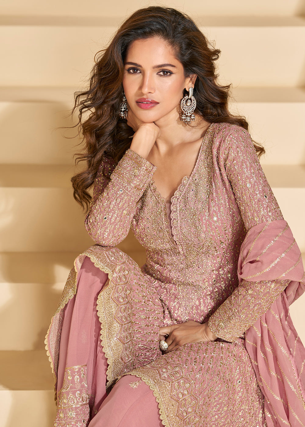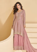 Pink colored sharara style kameez in georgette with zari & sequin embroidery work all over. Comes with matching colored bottom and dupatta. The semi-stitched kameez can be customised upto 42 inches. Do Note: All the accessories shown are for styling purposes only. Slight color variation may occur due to photographic reasons.