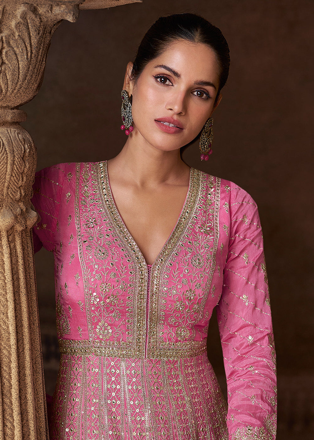 Pink colored straight cut style kameez in chinon with heavy Zari & sequin embroidery and mirror work all over. Comes with matching colored bottom and dupatta. The semi-stitched kameez can be customised upto 42 inches. Do Note: All the accessories shown are for styling purposes only. Slight color variation may occur due to photographic reasons.