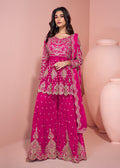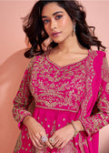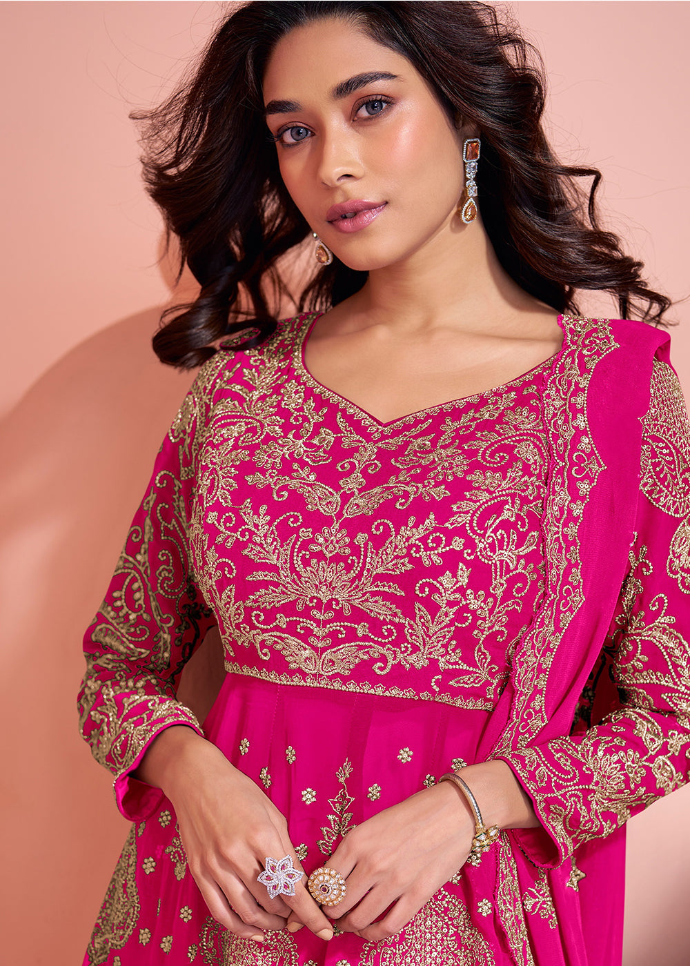 Pink colored straight cut style kameez in georgette with heavy zari & sequin embroidery work all over. Comes with matching colored bottom and dupatta. The semi-stitched kameez can be customised upto 42 inches. Do Note: All the accessories shown are for styling purposes only. Slight color variation may occur due to photographic reasons.