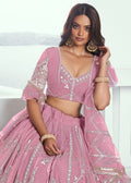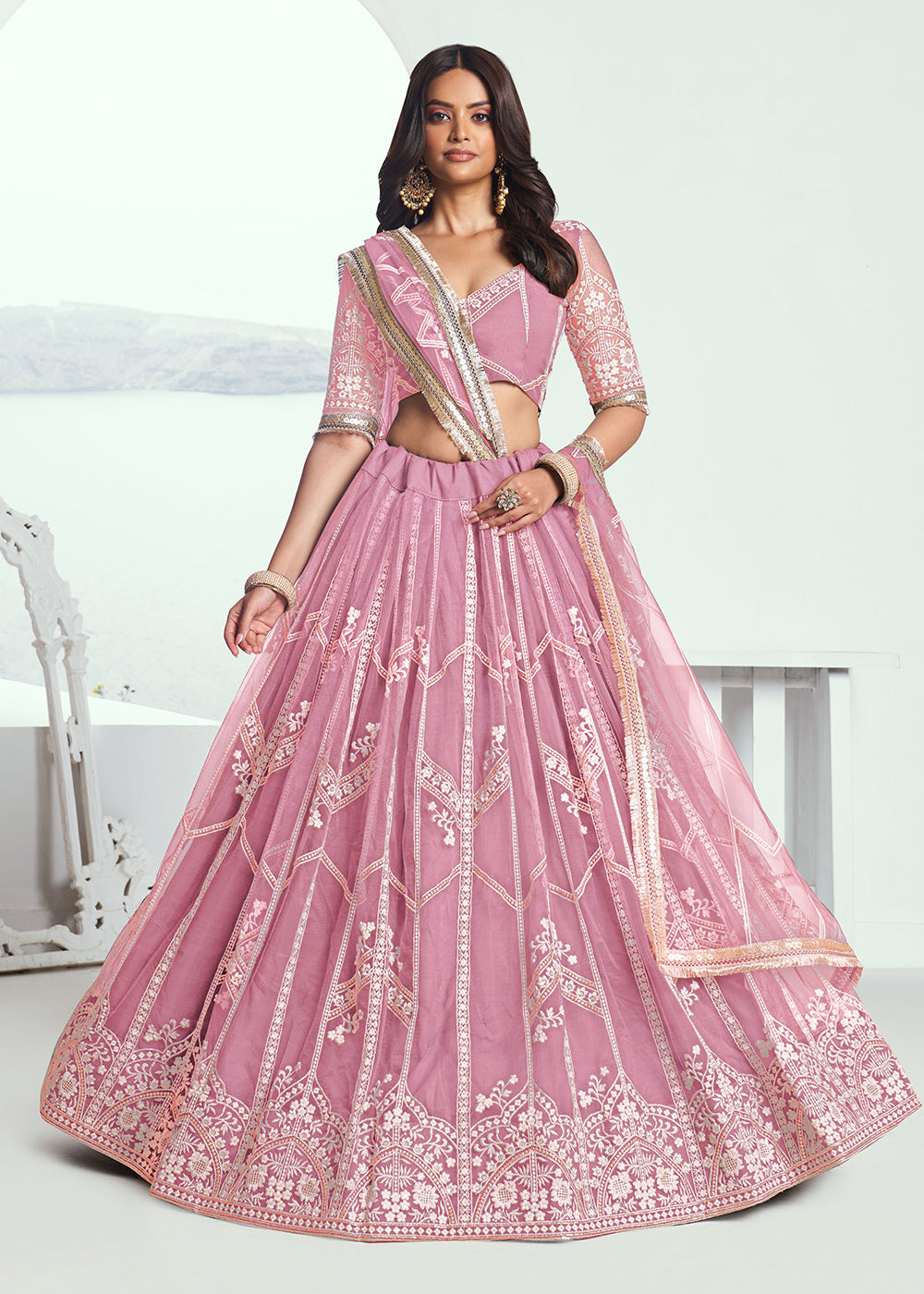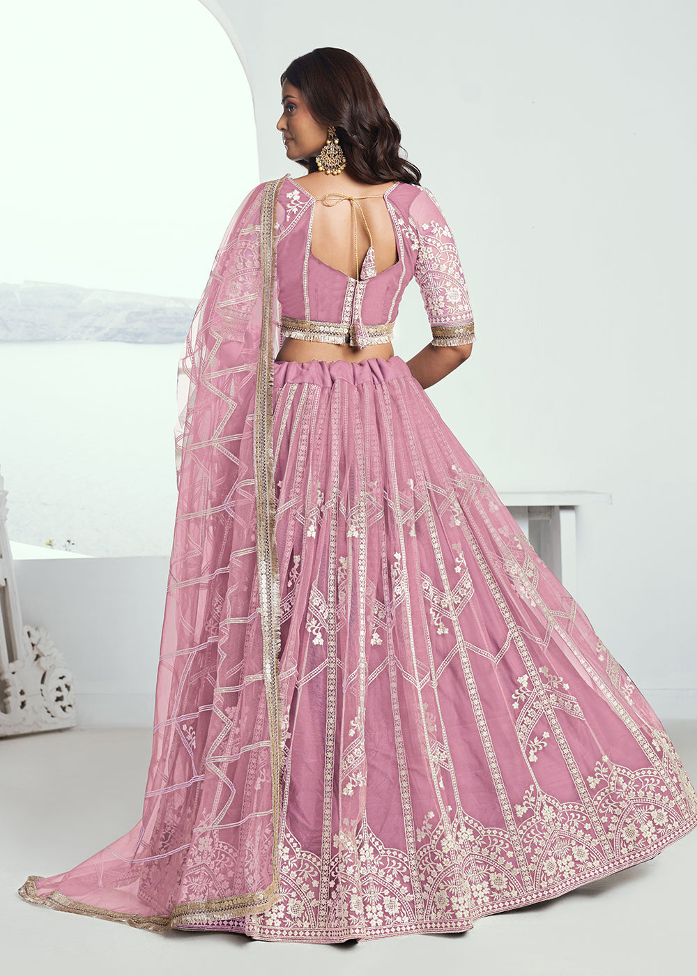 Pink color lehenga in net decorated all over heavy zari & thread embroidery work all over. Comes along with a matching color choli and net dupatta in similar work. The semi-stitched choli can be customized up to 42 inches. Do Note: All Accessories shown are for styling purpose only. Slight color variation may occur due to photographic reasons.