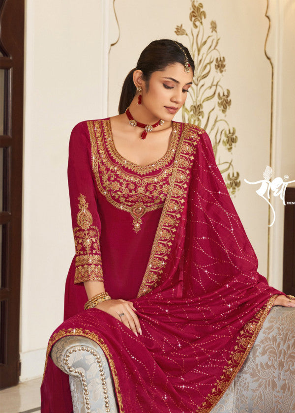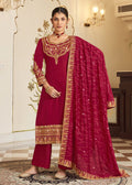 Pink color kameez in georgette with zari and sequins embroidery. Comes with a similarly embroidered georgette palazzo and dupatta. This semi-stitched kameez can be customized upto 42 inches.