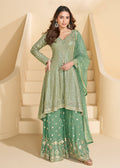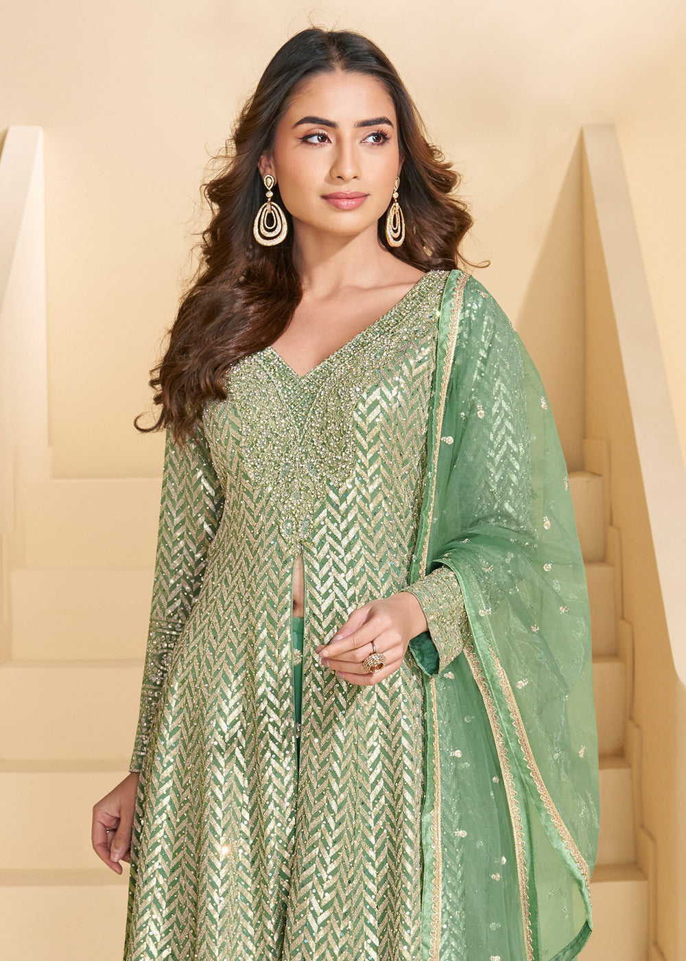 Green colored sharara style kameez in georgette with zari & sequin embroidery work all over. Comes with matching colored bottom and dupatta. The semi-stitched kameez can be customised upto 42 inches. Do Note: All the accessories shown are for styling purposes only. Slight color variation may occur due to photographic reasons.
