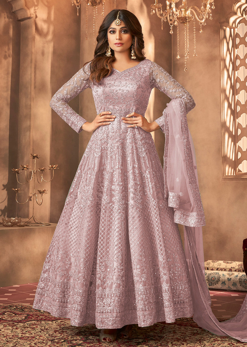 Purple colored anarkali style kameez in net with heavy zari & sequin embroidery work all over. Comes with matching colored santoon bottom and net dupatta. The semi-stitched kameez can be customised upto 44 inches. Do Note: All the accessories shown are for styling purposes only. Slight color variation may occur due to photographic reasons.