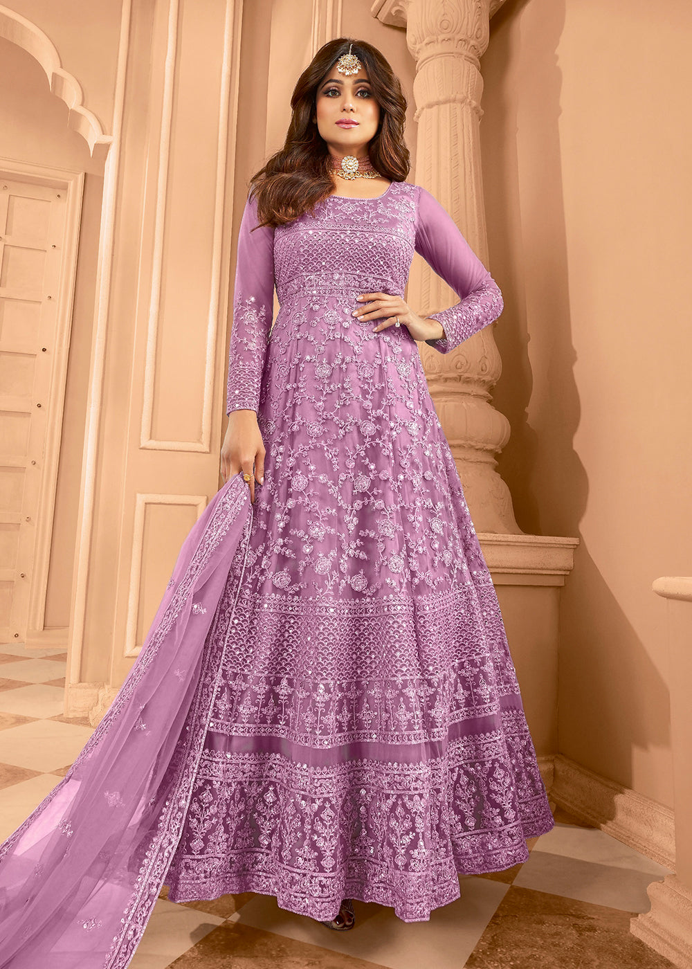 Purple colored anarkali style kameez in net with heavy zari & sequin embroidery work all over. Comes with matching colored santoon bottom and net dupatta. The semi-stitched kameez can be customised upto 44 inches. Do Note: All the accessories shown are for styling purposes only. Slight color variation may occur due to photographic reasons.