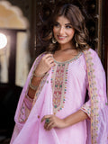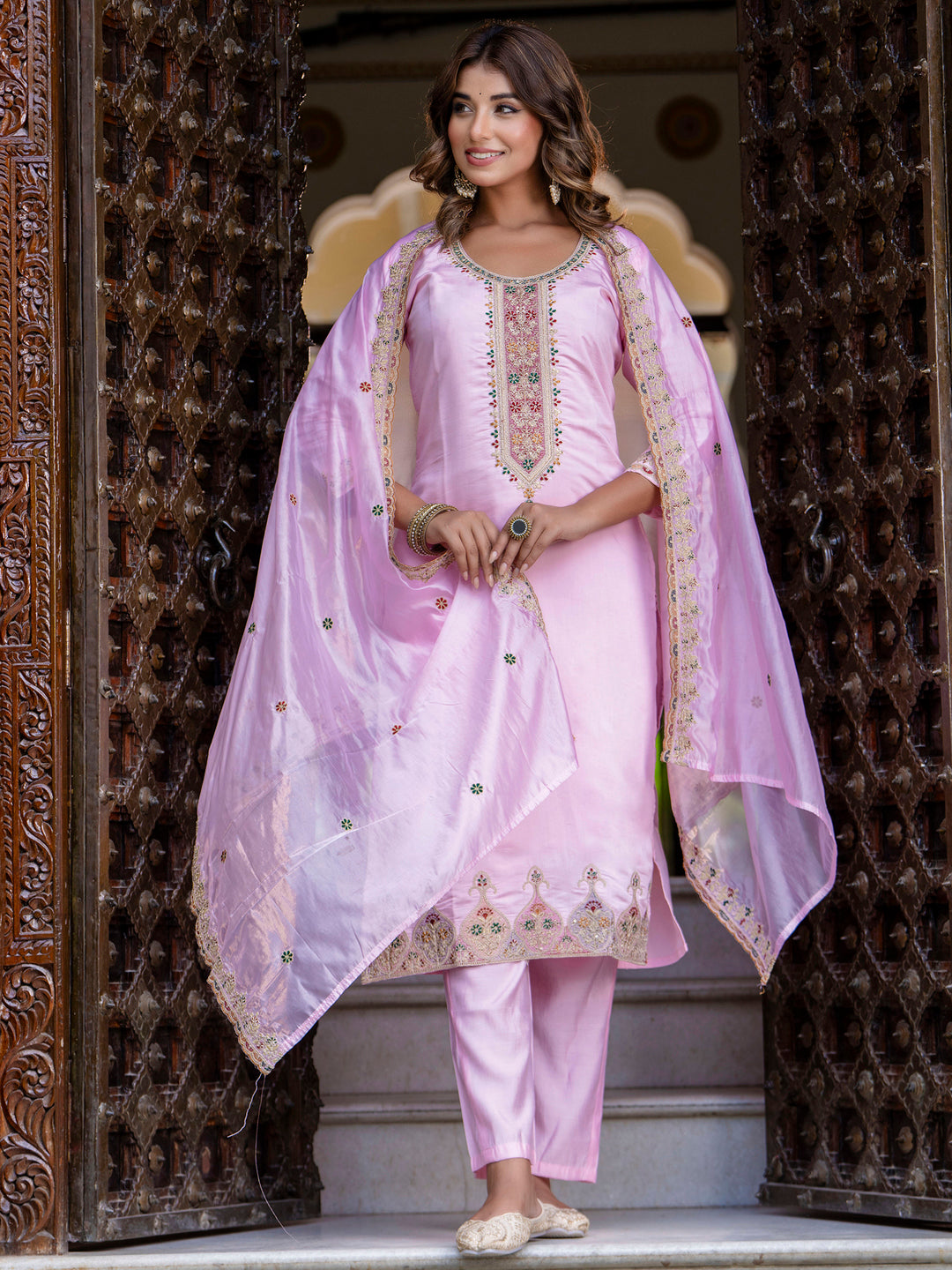 Purple colored straight cut style readymade kameez in heavy embroidery work all over. Comes with matching color bottom and dupatta. Do Note: All the accessories shown are for styling purposes only. Slight color variation may occur due to photographic reasons.