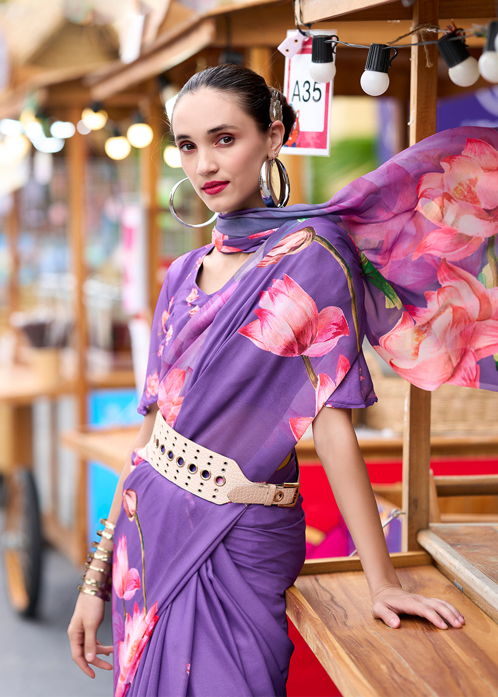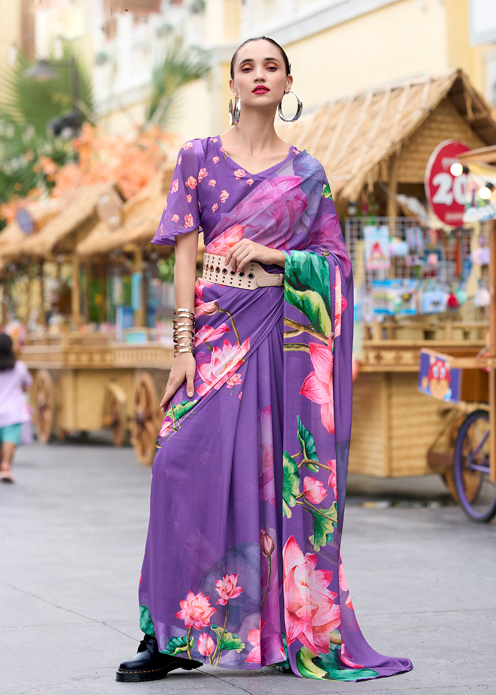 Purple georgette saree crafted in designer floral print work all over. Comes along with a matching color silk blouse in similar work . The un-stitched saree blouse may be customized up to 44 inches.