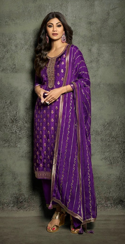 Purple colored straight cut kameez in jacquard silk with heavy woven embroidery work all over. Comes with matching colored bottom and chinon silk dupatta. The semi-stitched kameez can be customised upto 44 inches. Do Note: All the accessories shown are for styling purposes only. Slight color variation may occur due to photographic reasons.