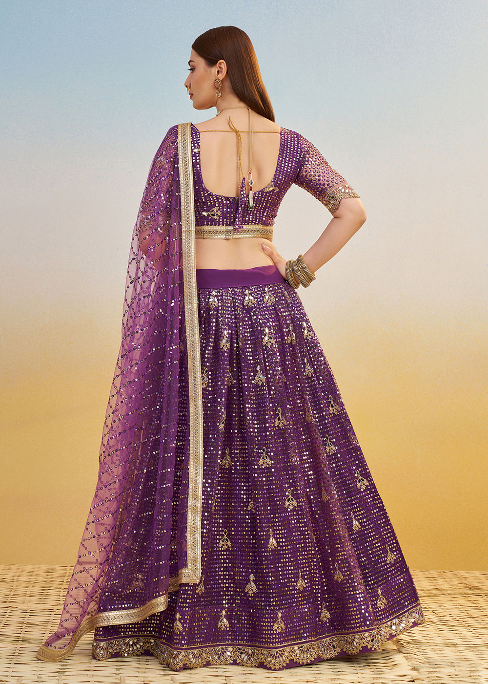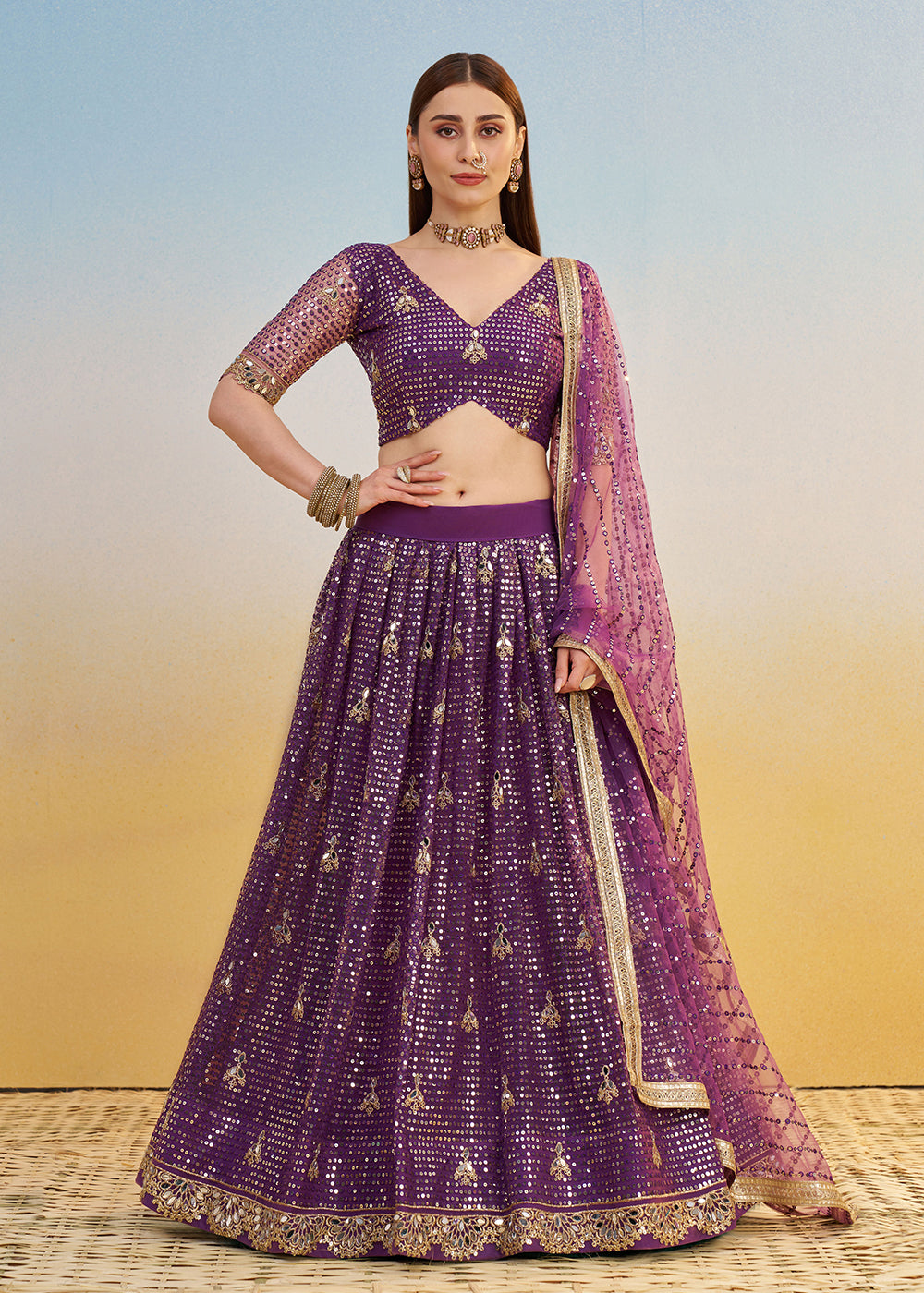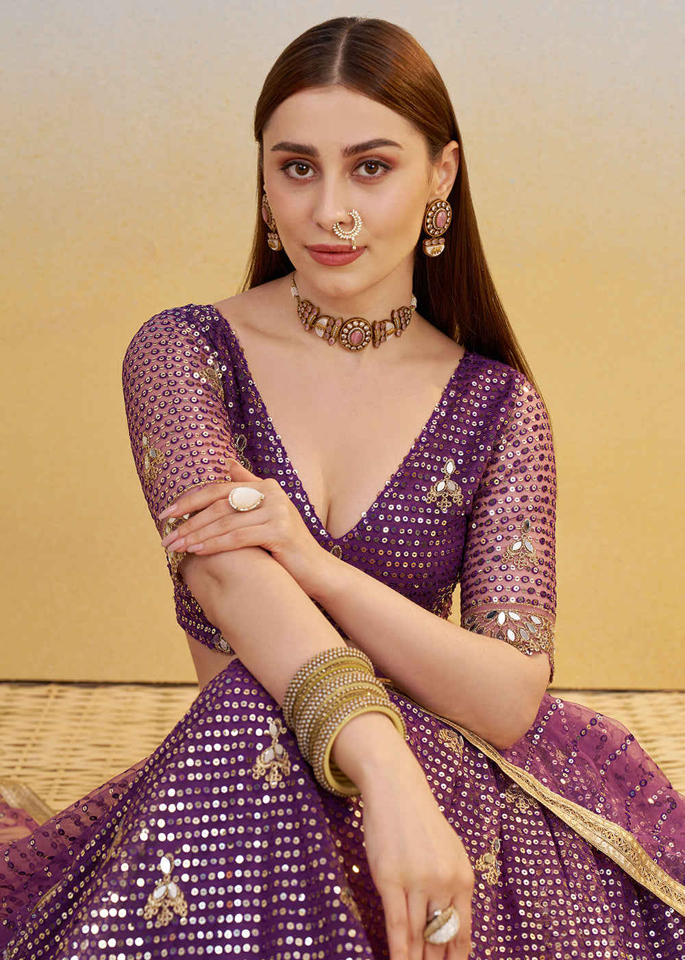 Purple color lehenga in net decorated all over heavy zari embroidery and sequin work all over. Comes along with a matching color choli and dupatta in similar work. The semi-stitched choli can be customized up to 42 inches. Do Note: All Accessories shown are for styling purpose only. Slight color variation may occur due to photographic reasons.