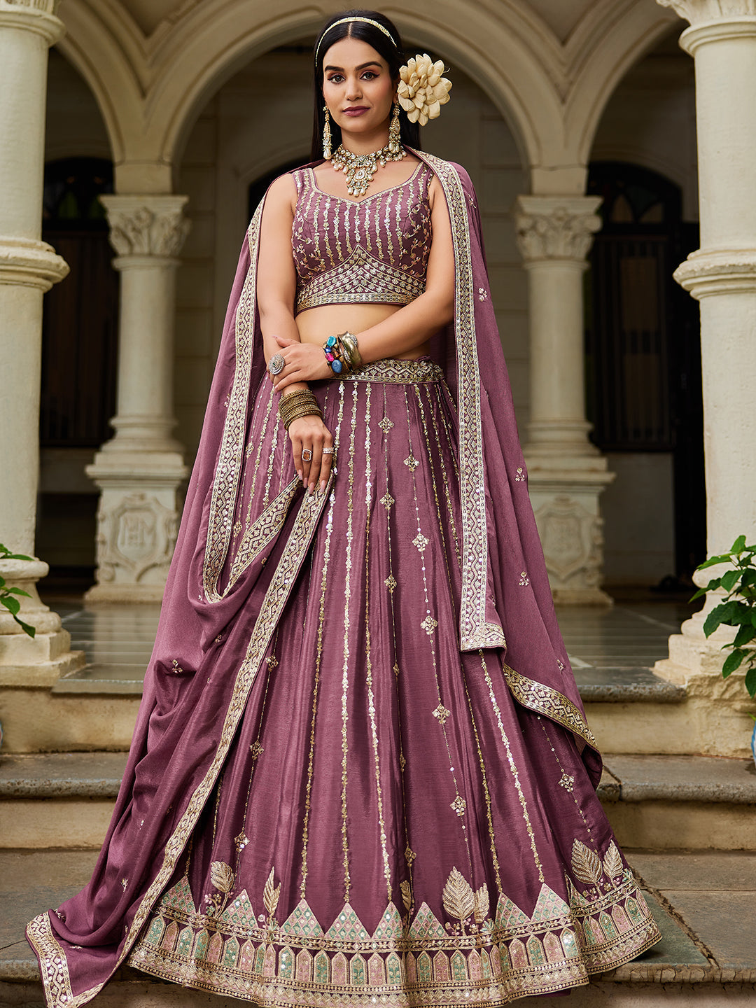 Purple color lehenga in georgette decorated all over heavy embroidery and sequin work all over. Comes along with a matching color choli and dupatta in similar work. The semi-stitched choli can be customized up to 42 inches. Do Note: All Accessories shown are for styling purpose only. Slight color variation may occur due to photographic reasons.