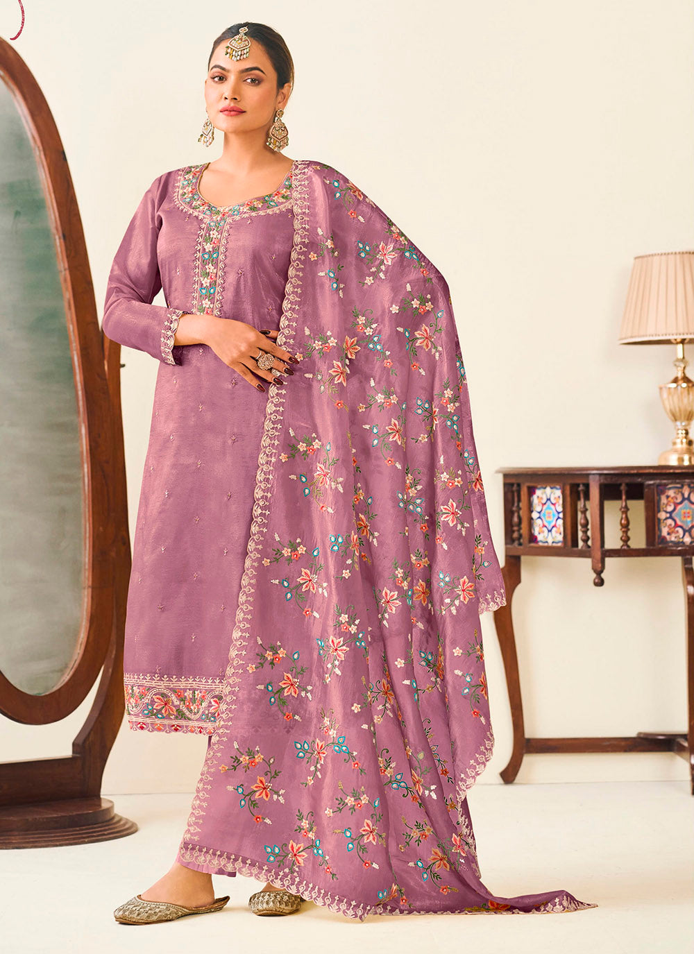 Purple colored straight cut style kameez in silk with thread embroidery work all over. Comes with matching colored bottom and dupatta. The semi-stitched kameez can be customised upto 42 inches. Do Note: All the accessories shown are for styling purposes only. Slight color variation may occur due to photographic reasons.