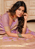 Purple designer silk saree crafted in heavy zari woven embroidered work all over. Comes along with a matching color silk blouse in similar work . The un-stitched saree blouse may be customized up to 44 inches.