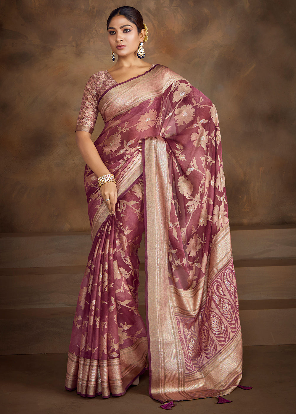 Purple satin silk saree crafted in zari woven embroidery all over. Comes along with a matching color silk blouse in similar work . The un-stitched saree blouse may be customized up to 44 inches.
