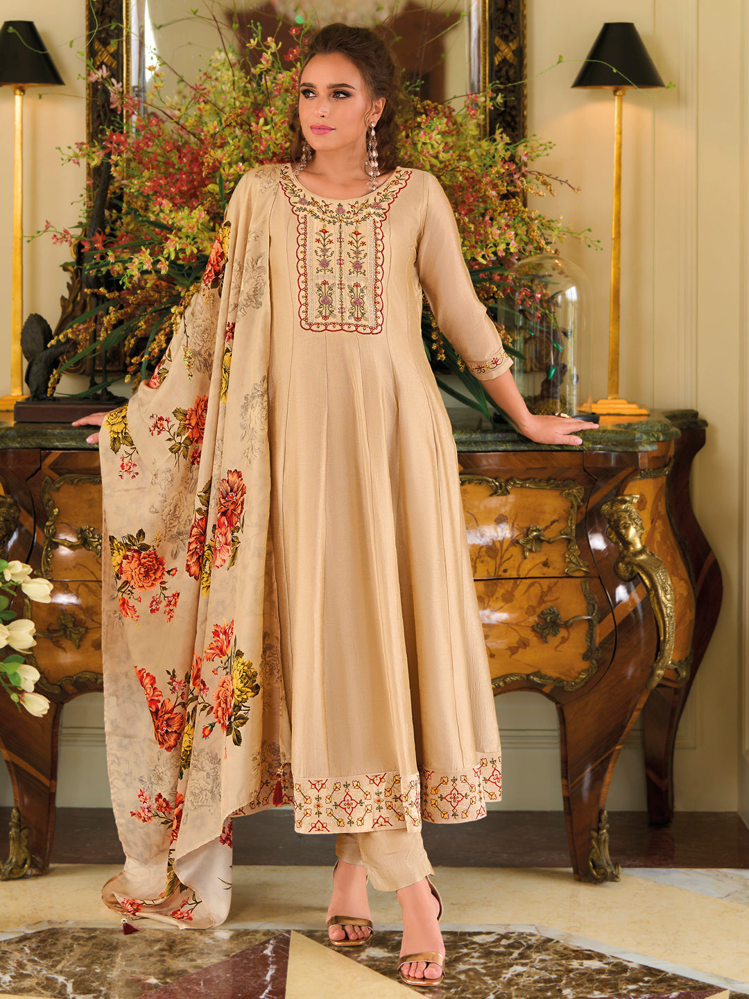 Beige colored straight cut style readymade kameez in heavy embroidery work all over. Comes with matching color bottom and printed dupatta. Do Note: All the accessories shown are for styling purposes only. Slight color variation may occur due to photographic reasons.
