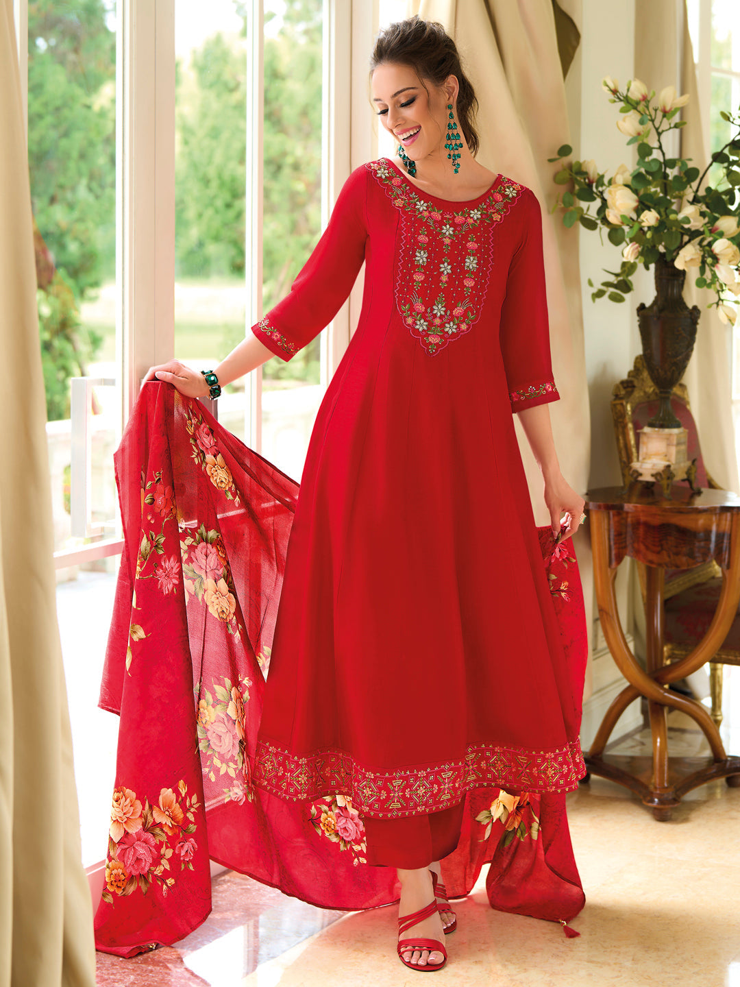 Red colored straight cut style readymade kameez in heavy embroidery work all over. Comes with matching color bottom and printed dupatta. Do Note: All the accessories shown are for styling purposes only. Slight color variation may occur due to photographic reasons.